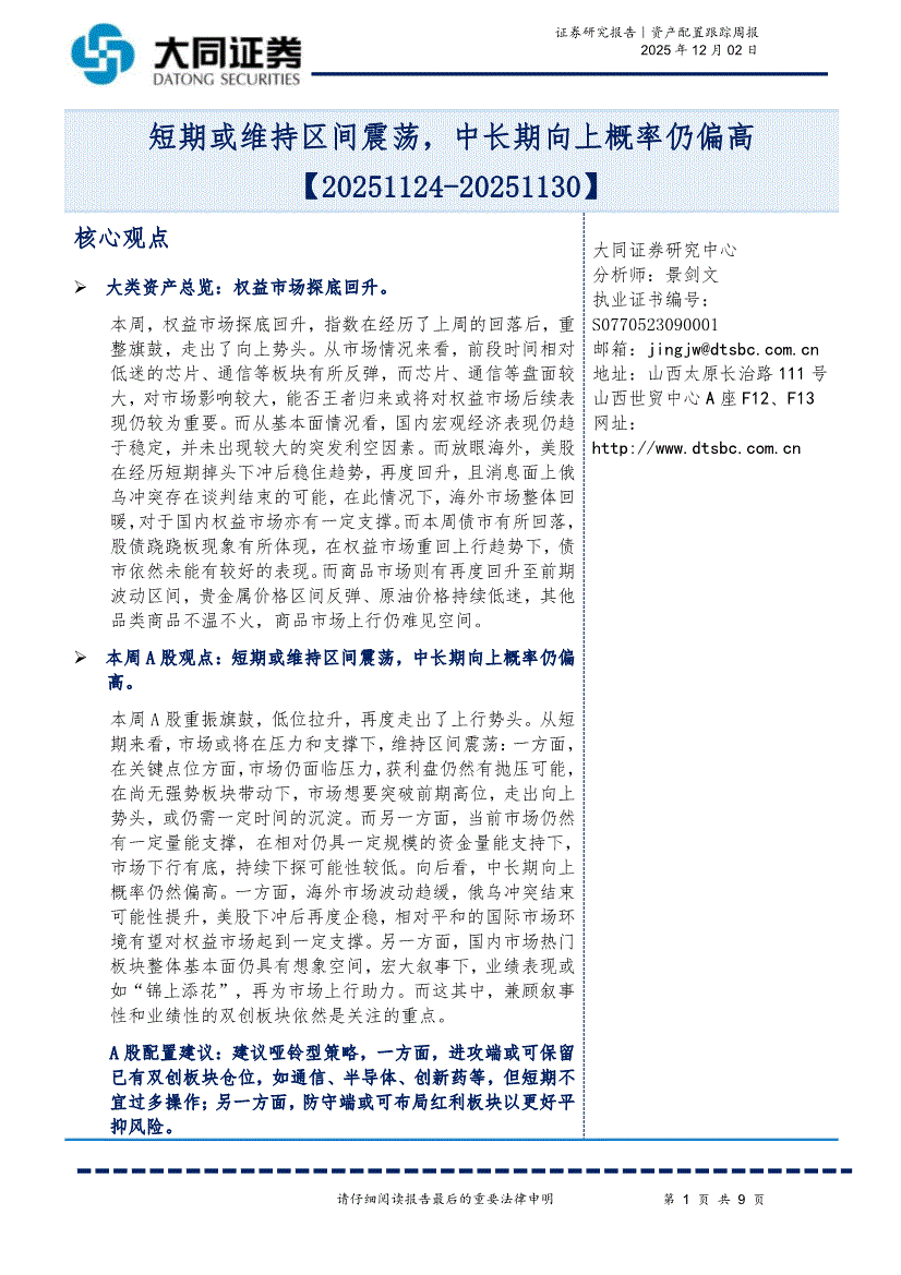 大同证券-资产配置跟踪周报:短期或维持区间震荡,中长期向上概率仍偏高-251202