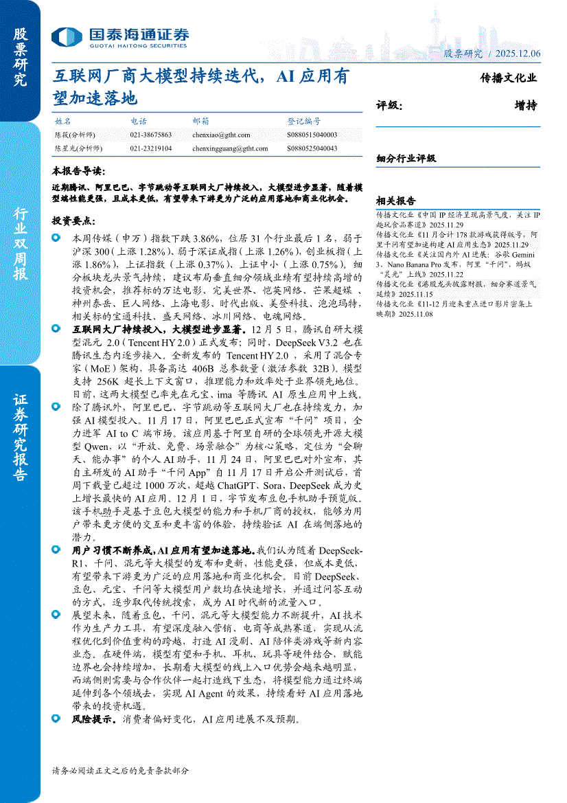 传播文化行业:国泰海通证券-传播文化行业双周报:互联网厂商大模型持续迭代,AI应用有望加速落地-251206