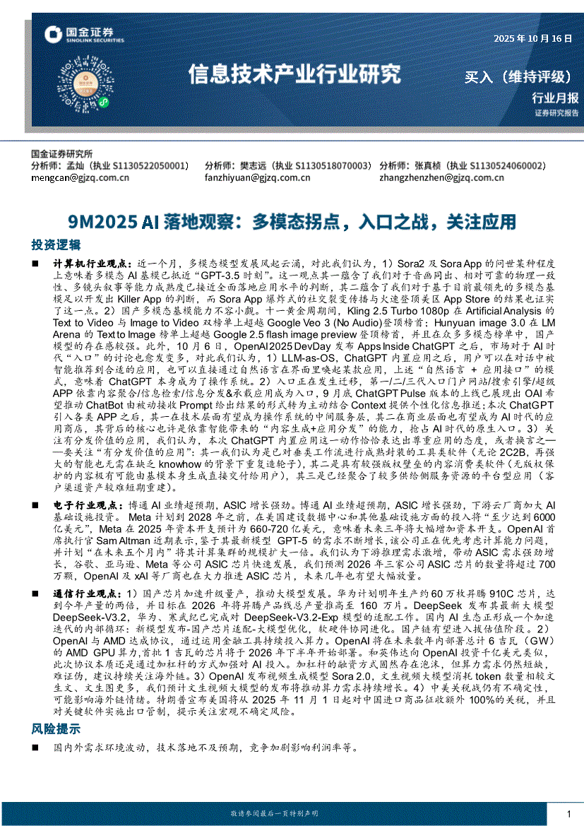 信息技术行业:国金证券-信息技术产业行业月报:9M2025 AI落地观察,多模态拐点,入口之战,关注应用-251016