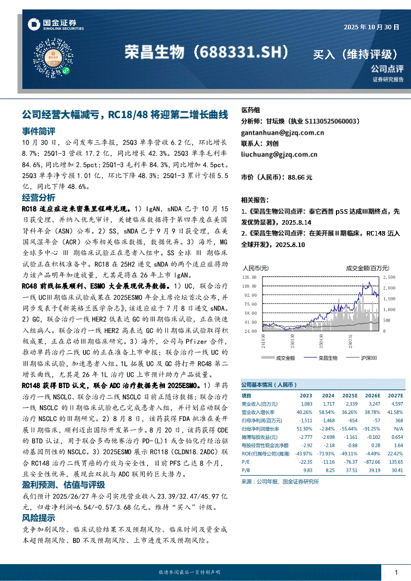 荣昌生物:国金证券-荣昌生物-688331-公司经营大幅减亏,RC18/48将迎第二增长曲线-251030