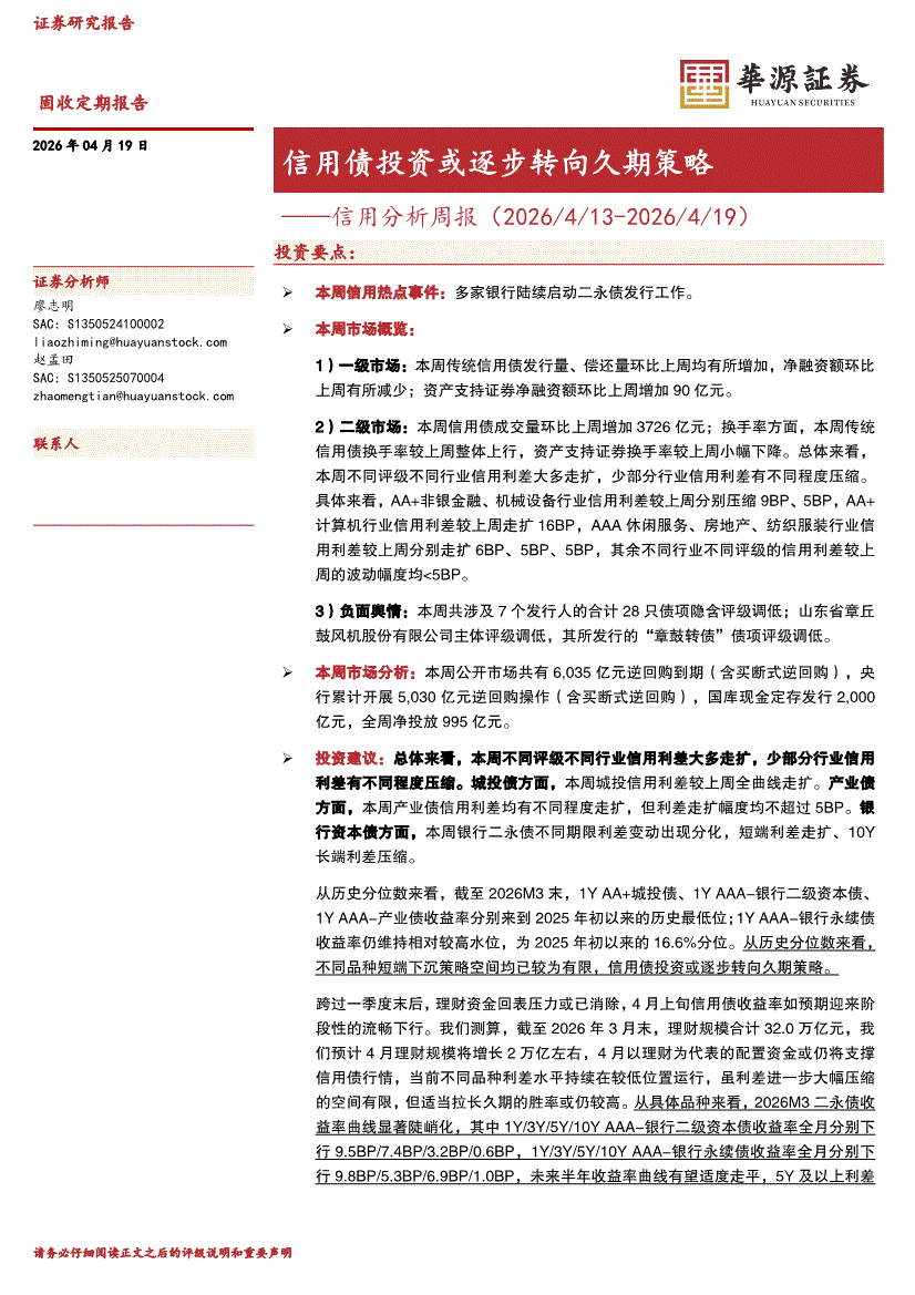 华源证券-信用分析周报:信用债投资或逐步转向久期策略-260419
