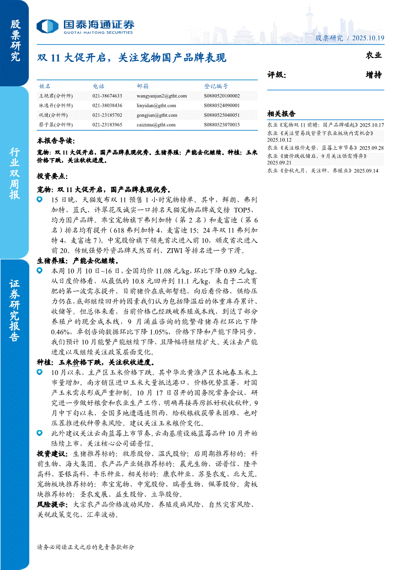 农业:国泰海通证券-农业:双11大促开启,关注宠物国产品牌表现-251019