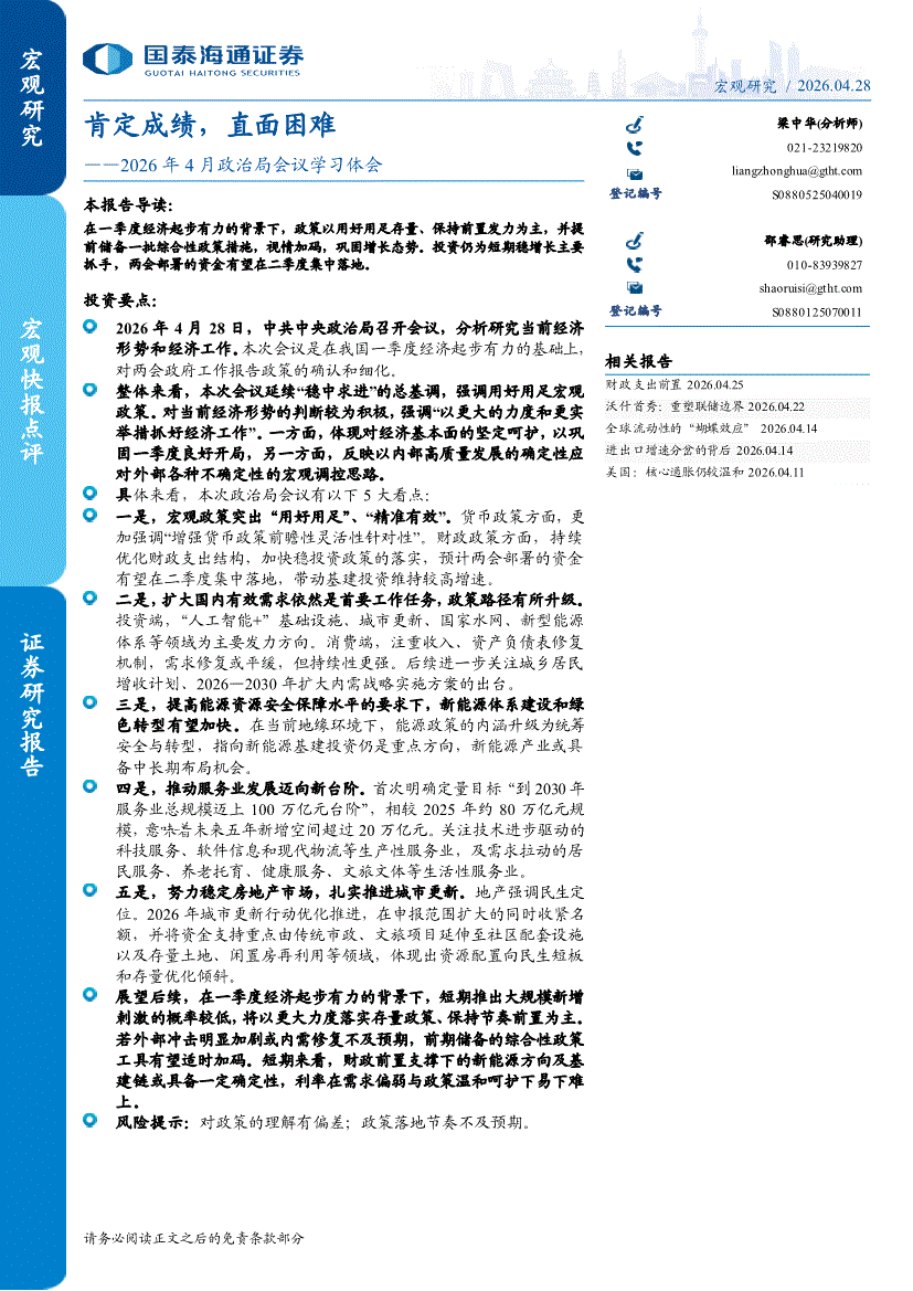 国泰海通证券-2026年4月政治局会议学习体会:肯定成绩,直面困难-260428
