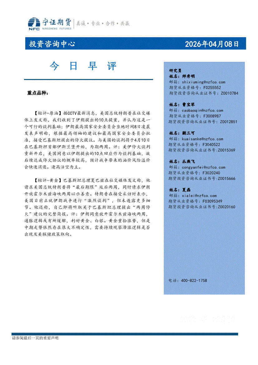 宁证期货-今日早评-260408