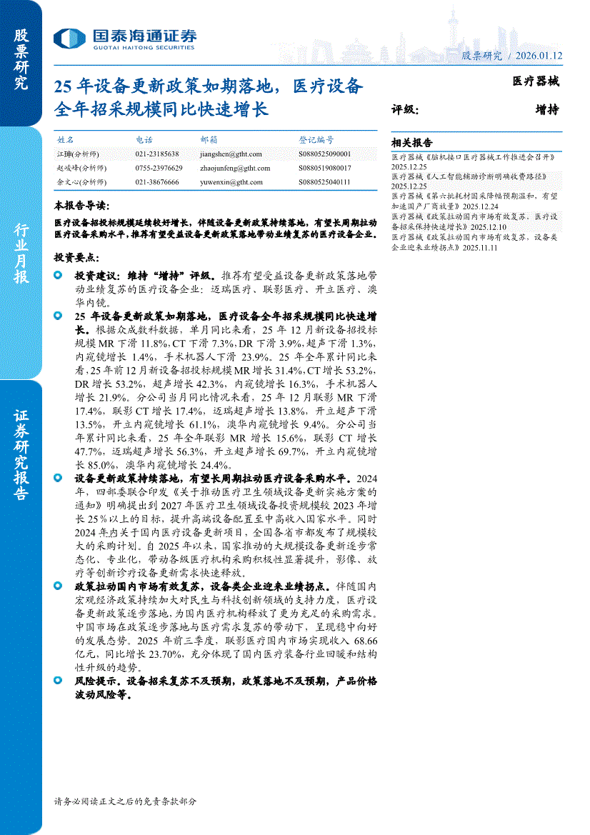 医疗器械行业:国泰海通证券-医疗器械行业:25年设备更新政策如期落地,医疗设备全年招采规模同比快速增长-260112