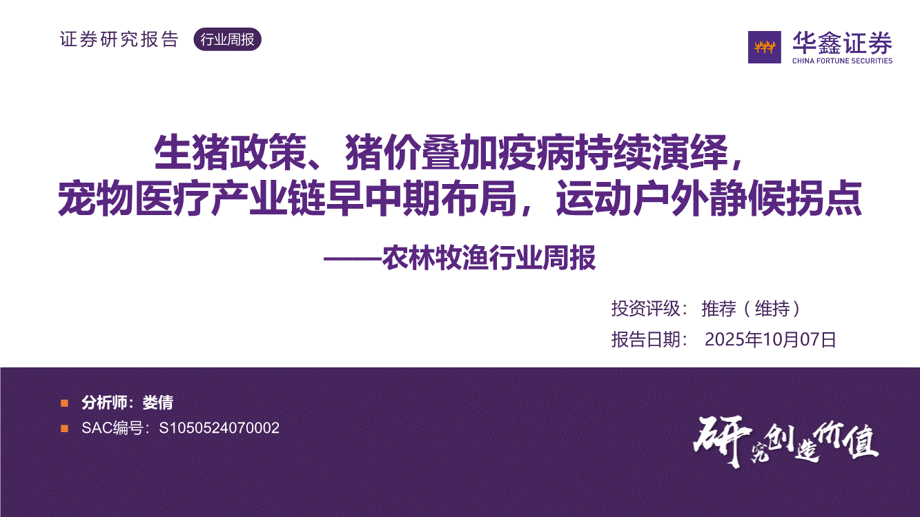 农林牧渔行业:华鑫证券-农林牧渔行业周报:生猪政策、猪价叠加疫病持续演绎,宠物医疗产业链早中期布局,运动户外静候拐点-251007