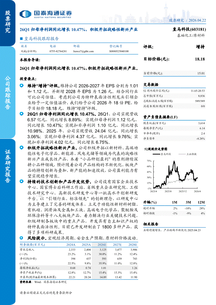 皇马科技:国泰海通证券-皇马科技-603181-跟踪报告:26Q1归母净利润同比增长10.47%,积极开拓战略性新兴产业-260422