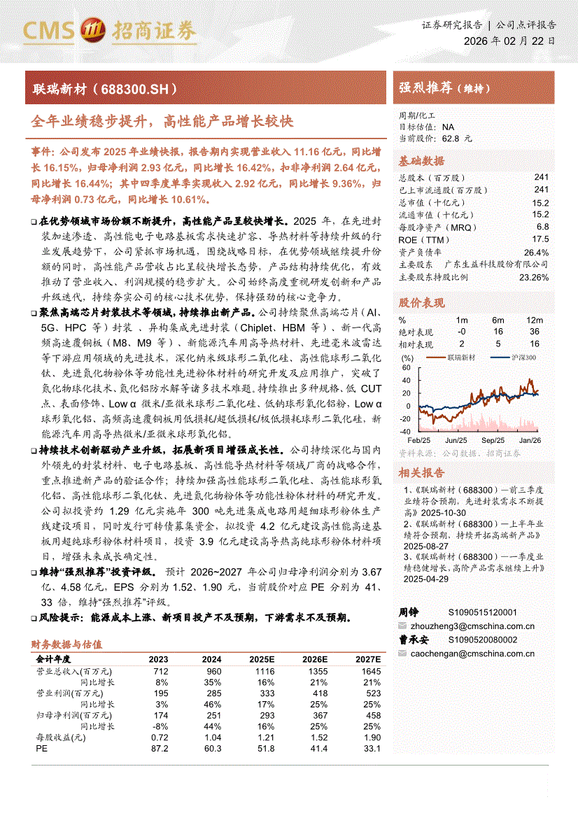 联瑞新材:招商证券-联瑞新材-688300-全年业绩稳步提升,高性能产品增长较快-260222
