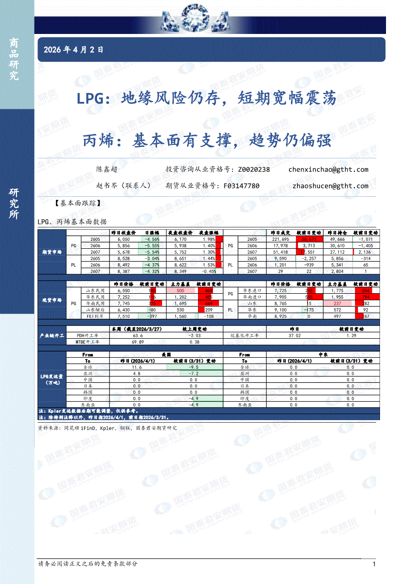 国泰君安期货-LPG:地缘风险仍存,短期宽幅震荡,丙烯,基本面有支撑,趋势仍偏强-260402