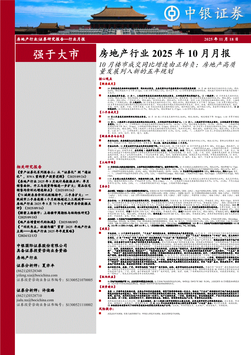 房地产行业:中银国际-房地产行业2025年10月月报:10月楼市成交同比增速由正转负;房地产高质量发展列入新的五年规划-251118
