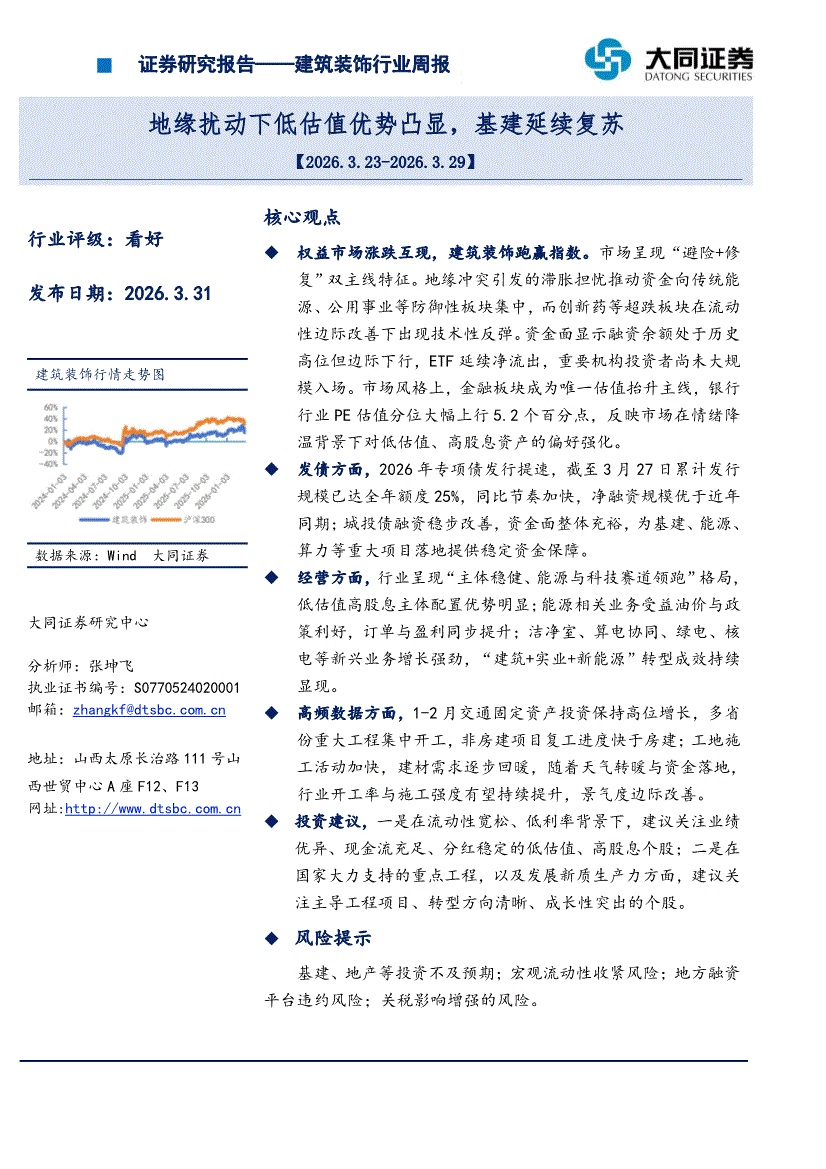 建筑装饰行业:大同证券-建筑装饰行业周报:地缘扰动下低估值优势凸显,基建延续复苏-260331
