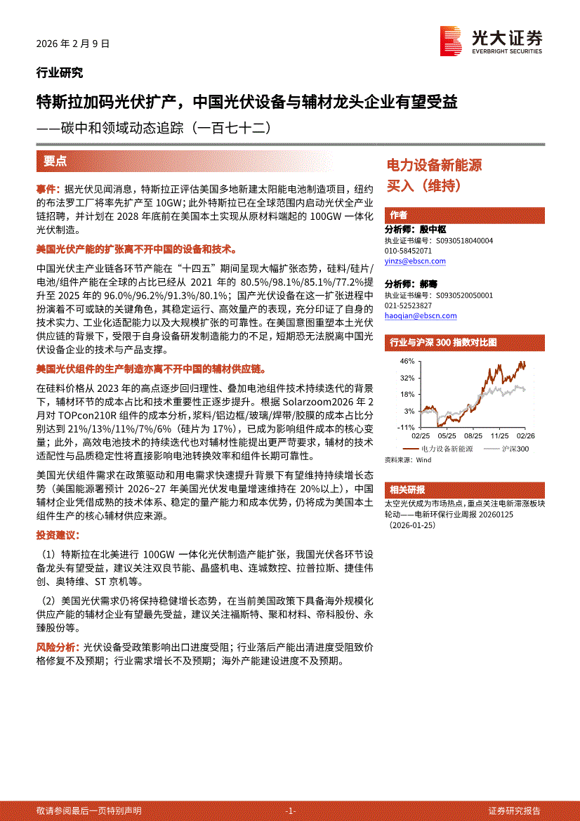 电力设备新能源行业:光大证券-电力设备新能源行业碳中和领域动态追踪(一百七十二):特斯拉加码光伏扩产,中国光伏设备与辅材龙头企业有望受益-260209