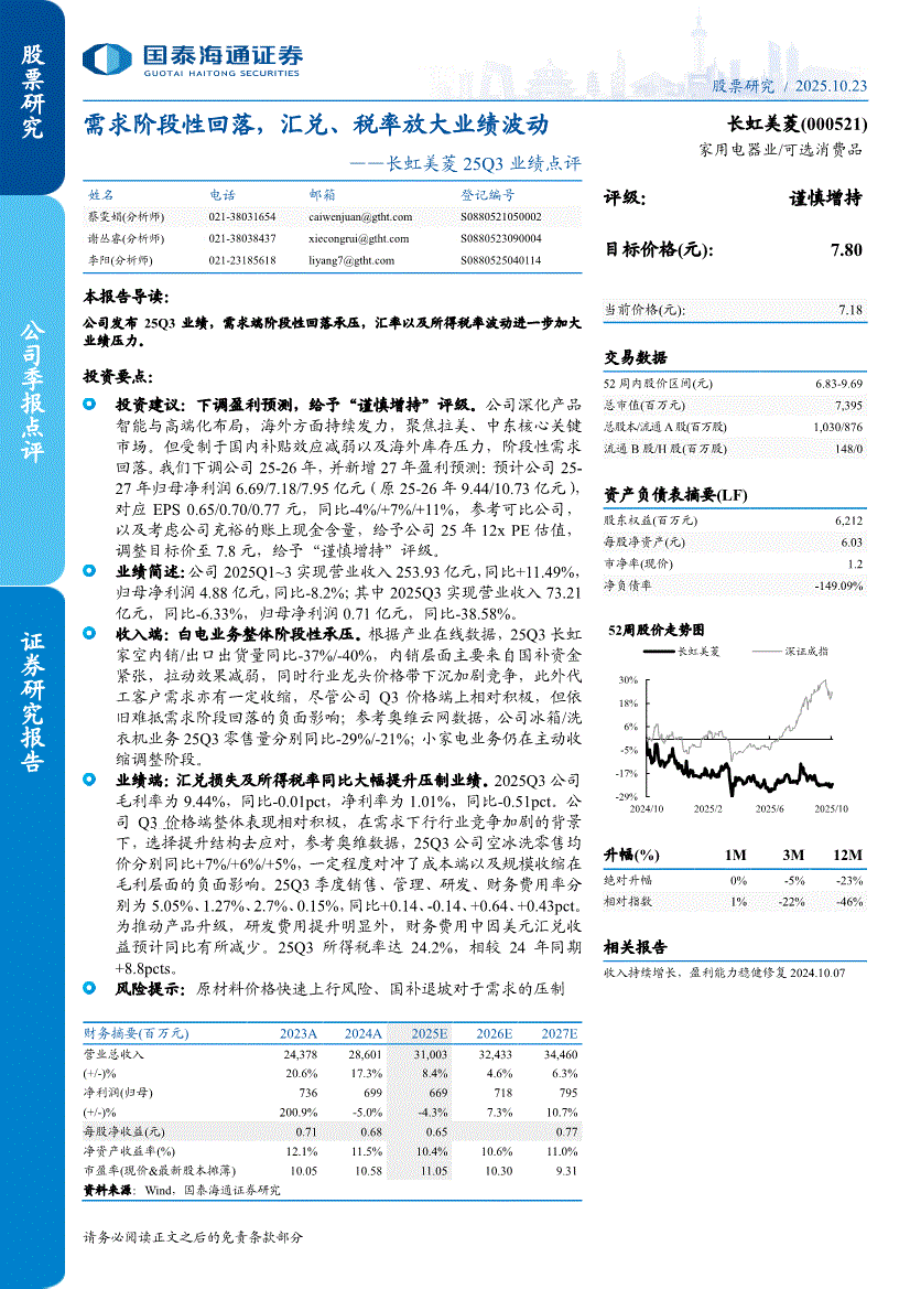 长虹美菱:国泰海通证券-长虹美菱-000521-25Q3业绩点评:需求阶段性回落,汇兑、税率放大业绩波动-251023