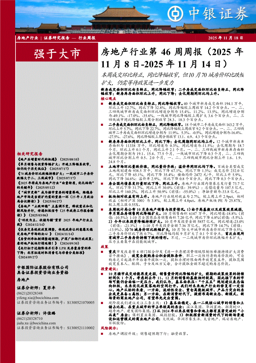 房地产行业:中银国际-房地产行业第46周周报(2025年11月8日~2025年11月14日):本周成交环比转正,同比降幅收窄,但10月70城房价环比跌幅扩大,仍需等待政策进一步发力-251118