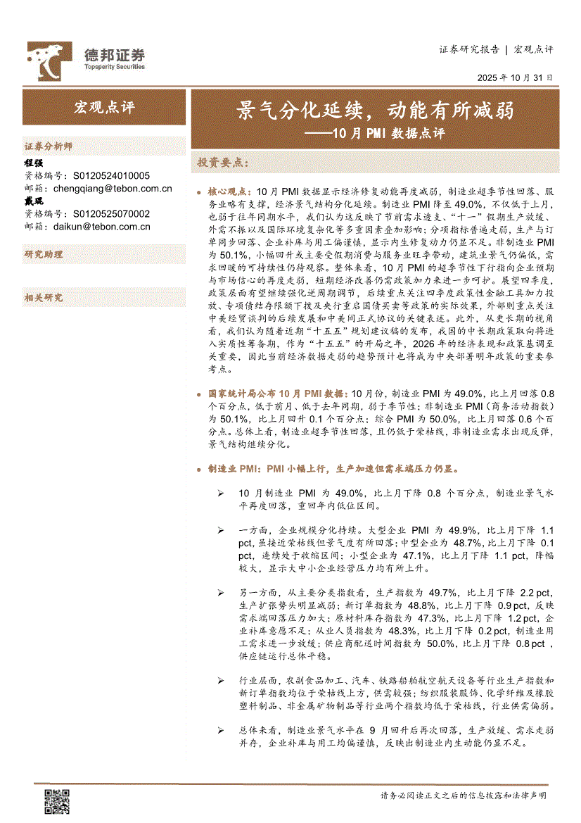 德邦证券-10月PMI数据点评:景气分化延续,动能有所减弱-251031