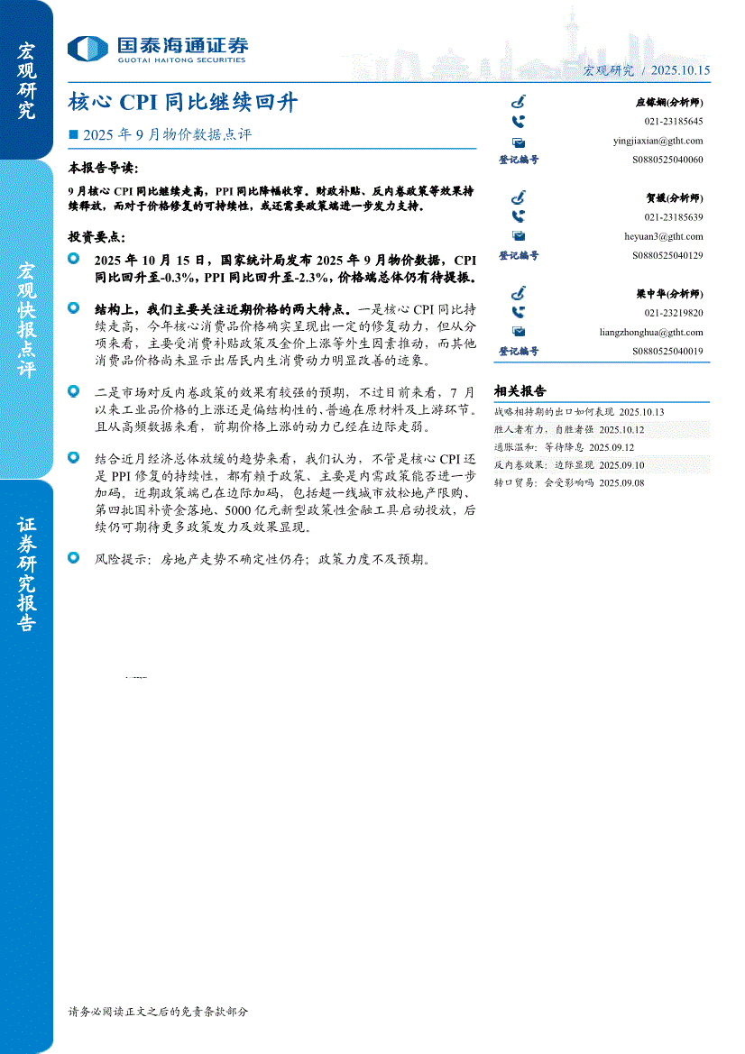 国泰海通证券-2025年9月物价数据点评:核心CPI同比继续回升-251015