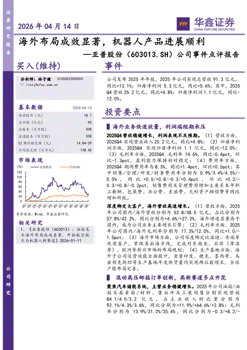 亚普股份:华鑫证券-亚普股份-603013-公司事件点评报告:海外布局成效显著,机器人产品进展顺利-260414