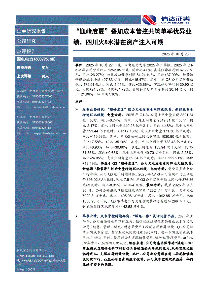 国电电力:信达证券-国电电力-600795-“迎峰度夏”叠加成本管控共筑单季优异业绩,四川火&水潜在资产注入可期-251028