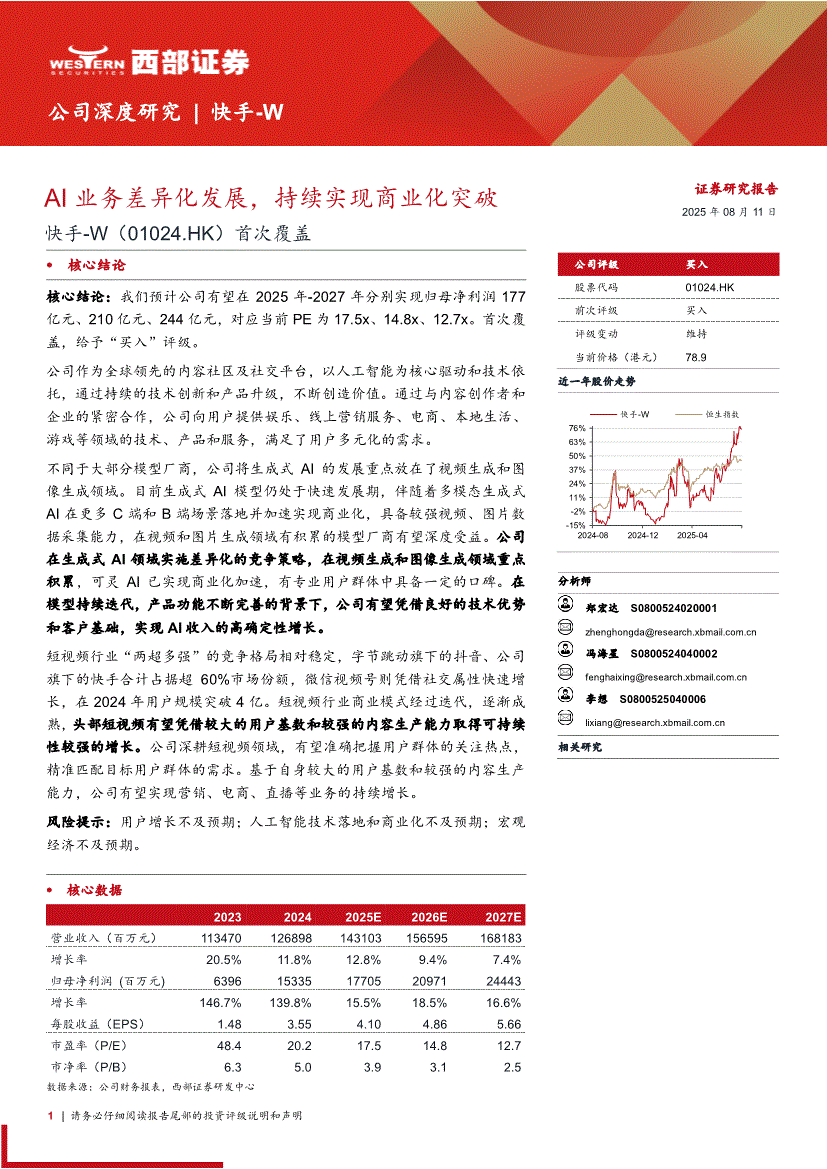 快手~W:西部证券-快手~W-1024.HK-首次覆盖:AI业务差异化发展,持续实现商业化突破-250811