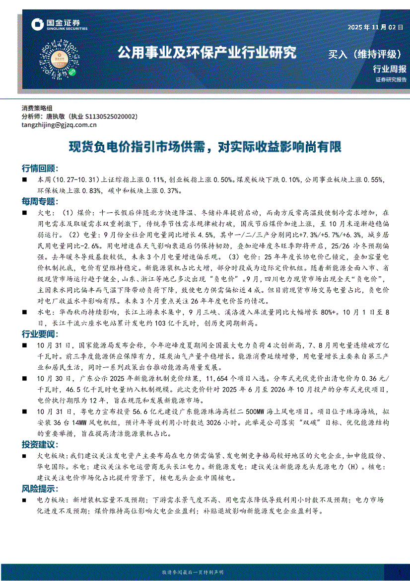 公用事业及环保产业行业:国金证券-公用事业及环保产业行业周报:现货负电价指引市场供需,对实际收益影响尚有限-251102