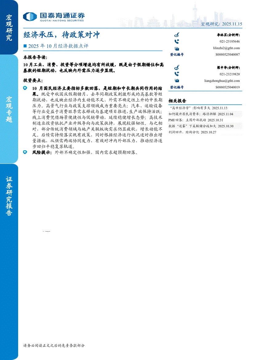 国泰海通证券-2025年10月经济数据点评:经济承压,待政策对冲-251115