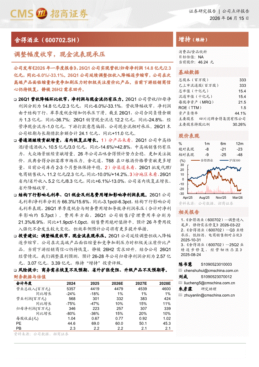 舍得酒业:招商证券-舍得酒业-600702-调整幅度收窄,现金流表现承压-260415