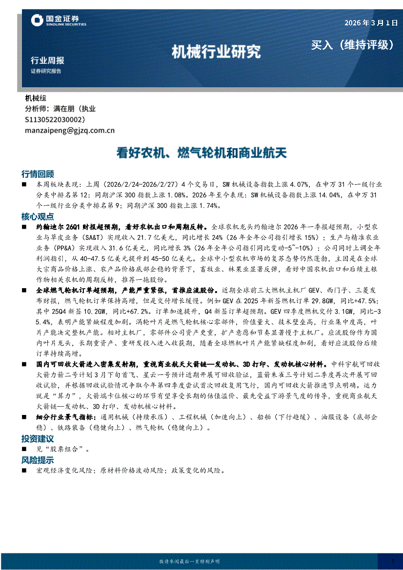 机械行业:国金证券-机械行业周报:看好农机、燃气轮机和商业航天-260301