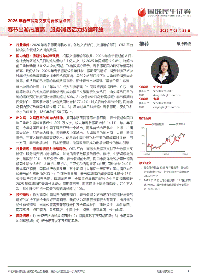 消费者服务行业:国联民生证券-消费者服务行业2026年春节假期文旅消费数据点评:春节出游热度高,服务消费活力持续释放-260223