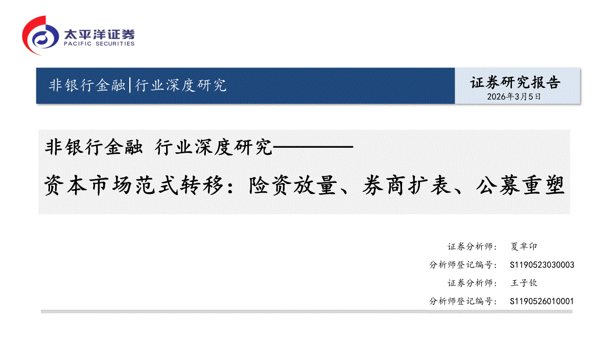 非银行金融行业:太平洋证券-非银行金融行业深度研究:资本市场范式转移,险资放量、券商扩表、公募重塑-260305
