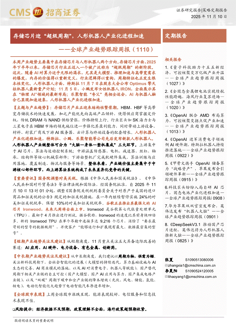 招商证券-全球产业趋势跟踪周报(1110):存储芯片迎“超级周期”,人形机器人产业化进程加速-251110