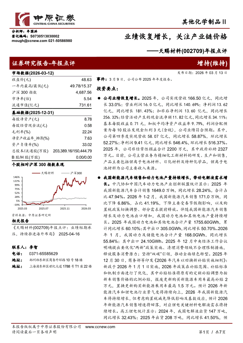 天赐材料:中原证券-天赐材料-002709-年报点评:业绩恢复增长,关注产业链价格-260313