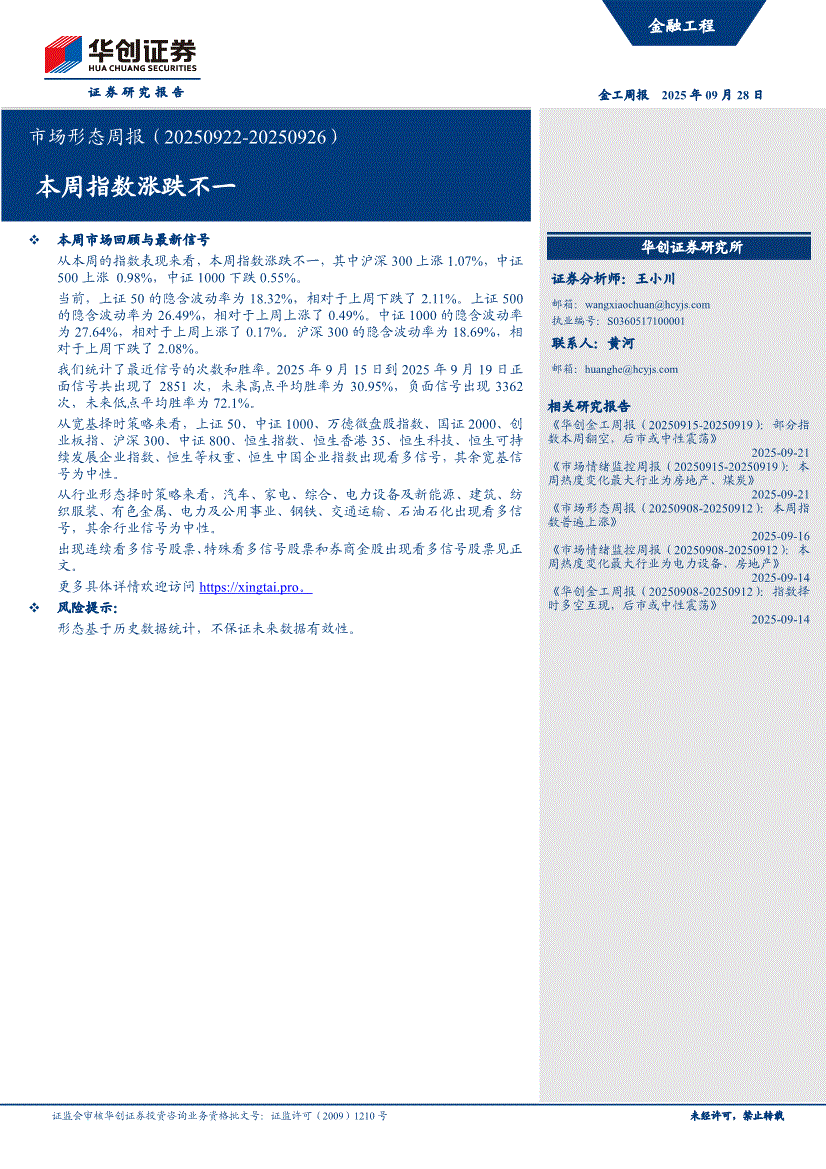 华创证券-【金工周报】部分指数本周翻空,后市或中性震荡-250921