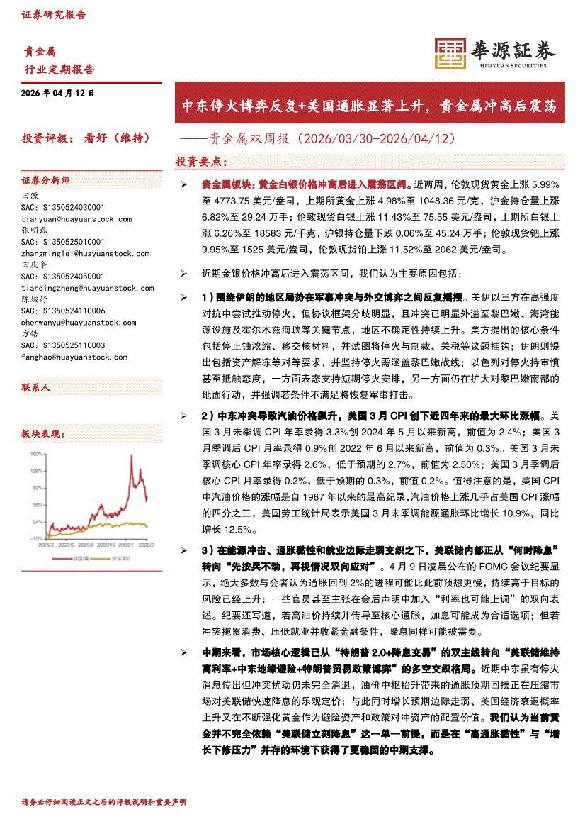 贵金属行业:华源证券-贵金属行业双周报:中东停火博弈反复+美国通胀显著上升,贵金属冲高后震荡-260412