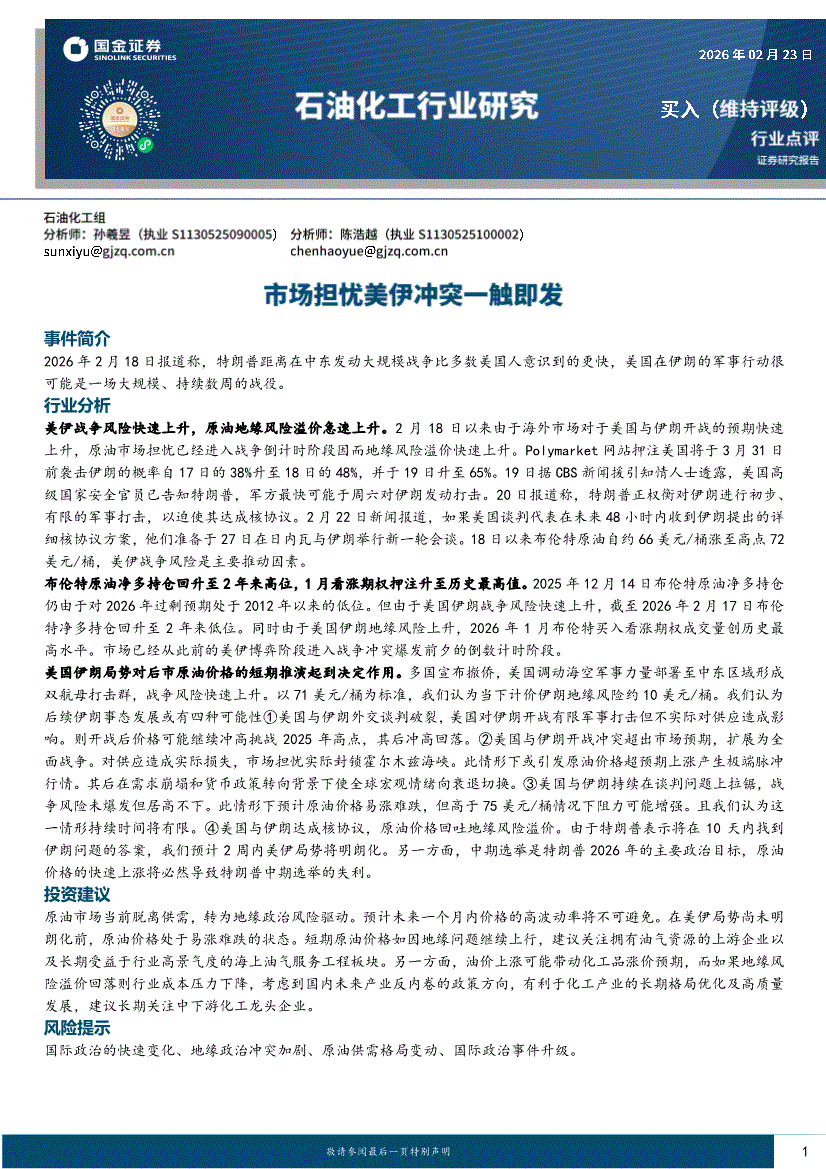 石油化工行业:国金证券-石油化工行业点评:市场担忧美伊冲突一触即发-260223