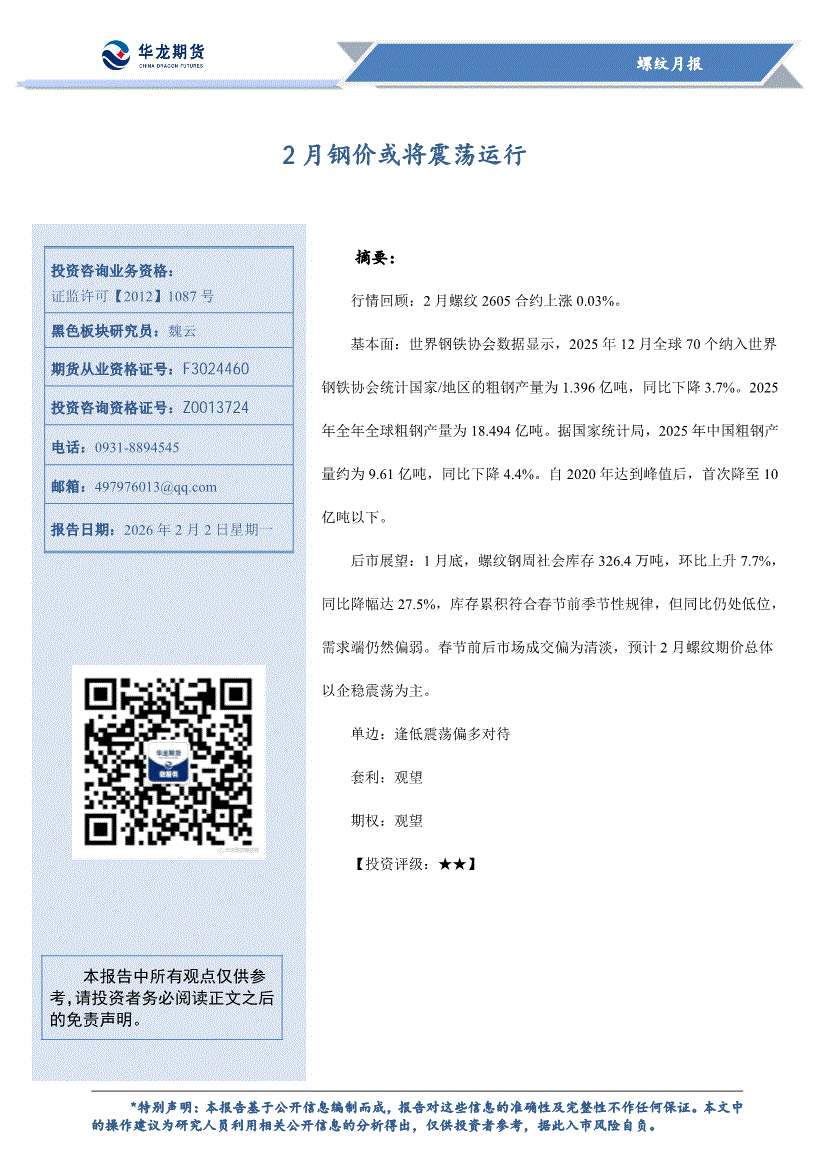 华龙期货-螺纹月报:2月钢价或将震荡运行-260202