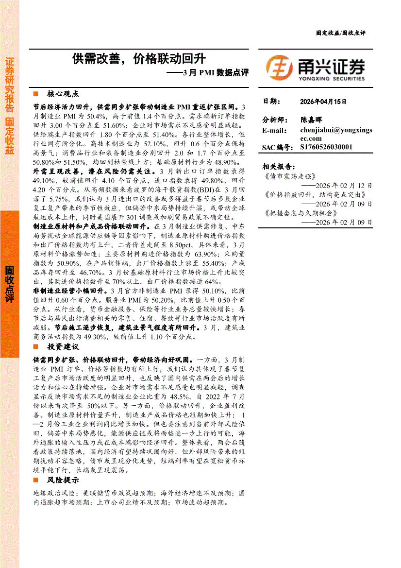 甬兴证券-3月PMI数据点评:供需改善,价格联动回升-260415