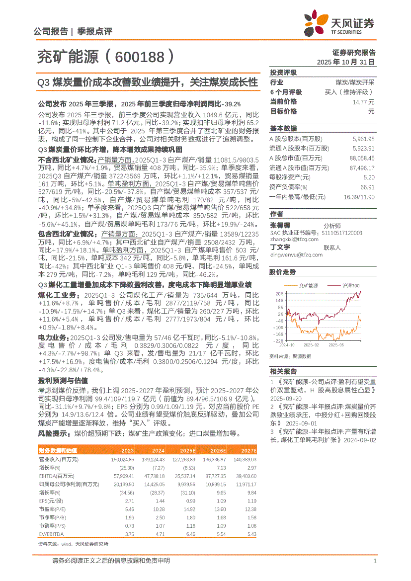 兖矿能源:天风证券-兖矿能源-600188-Q3煤炭量价成本改善致业绩提升,关注煤炭成长性-251031