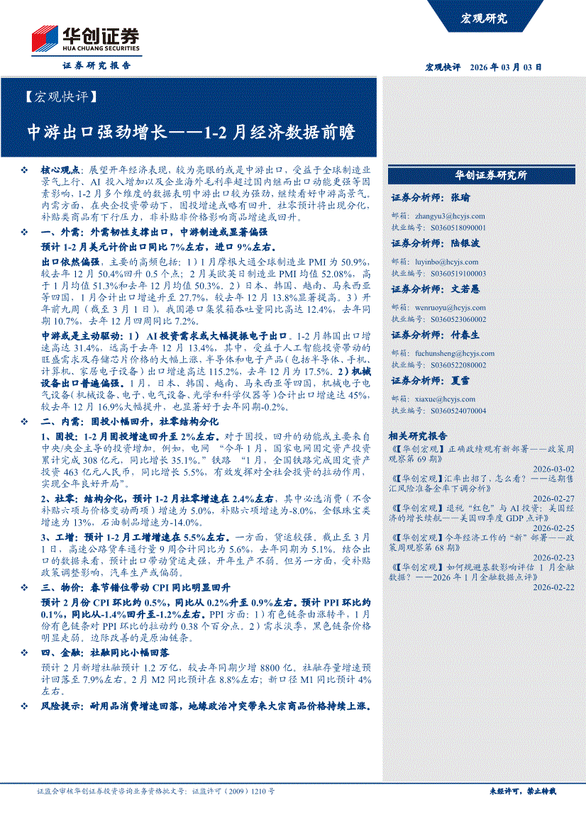 华创证券-【宏观快评】中游出口强劲增长——1~2月经济数据前瞻-260303
