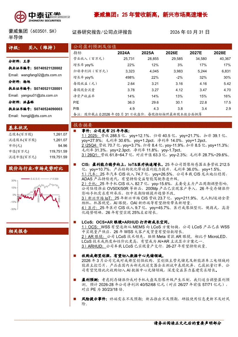 豪威集团:中泰证券-豪威集团-603501-25年营收新高,新兴市场高速增长-260331