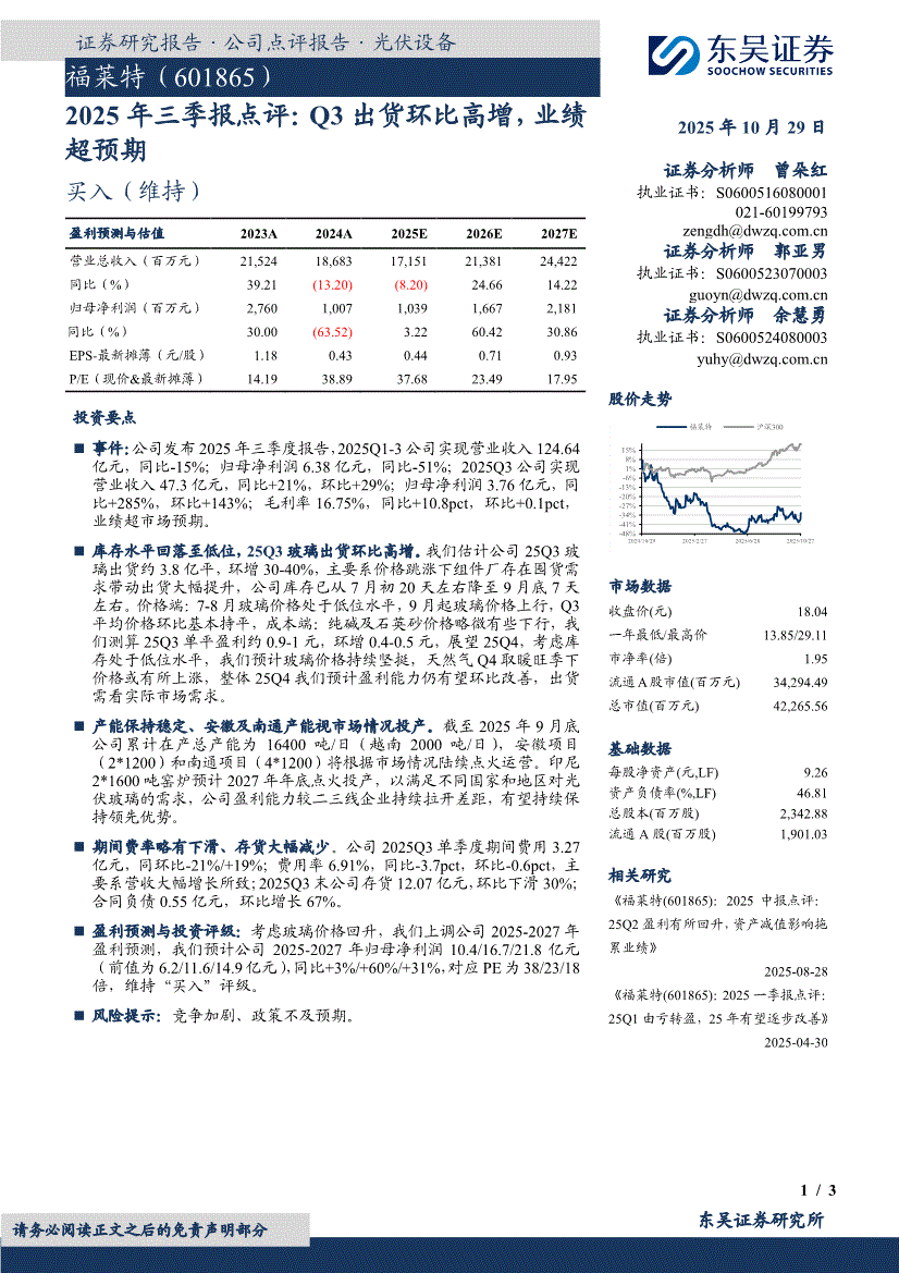 福莱特:东吴证券-福莱特-601865-2025年三季报点评:Q3出货环比高增,业绩超预期-251029