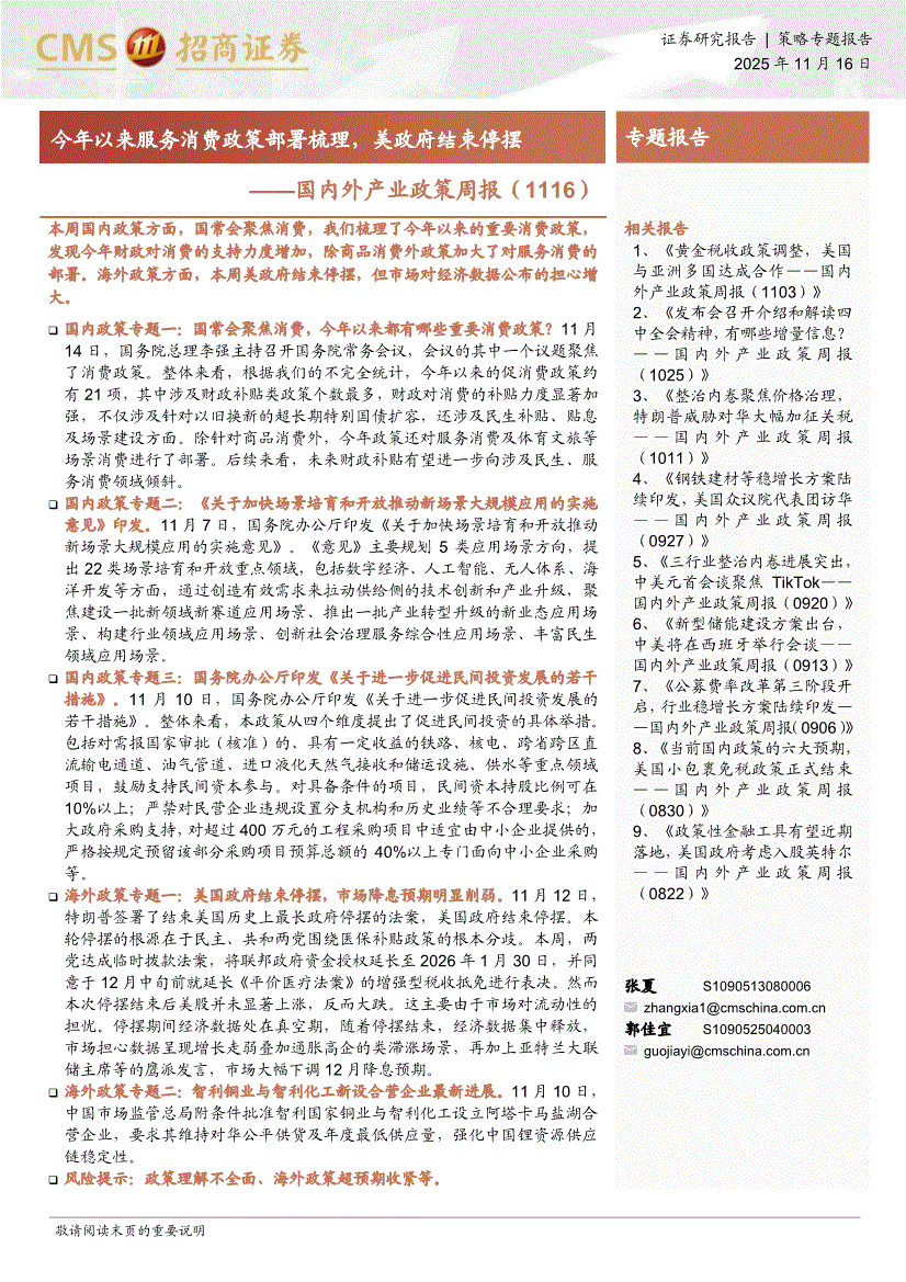 招商证券-国内外产业政策周报:今年以来服务消费政策部署梳理,美政府结束停摆-251116