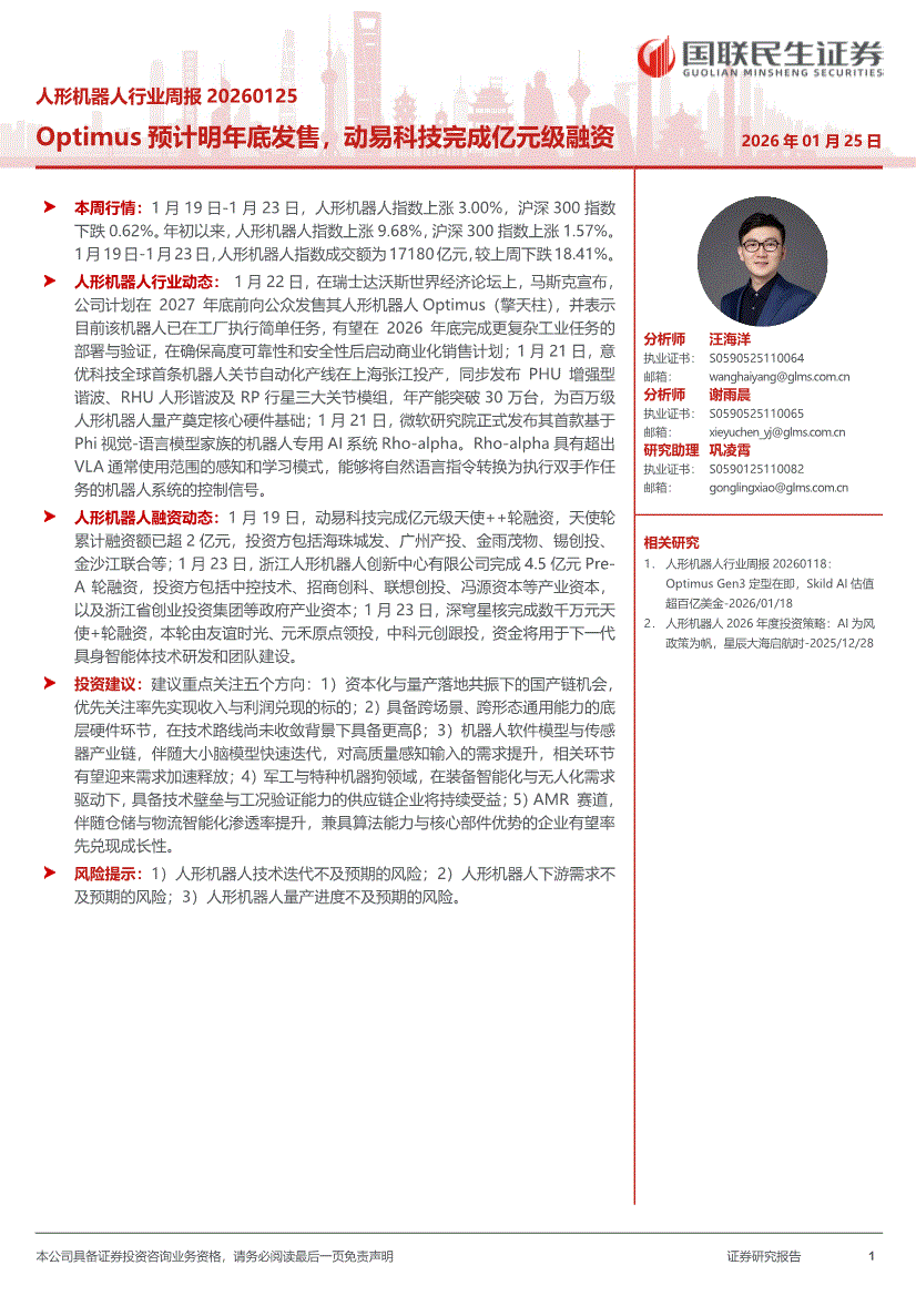 人形机器人行业:国联民生证券-人形机器人行业周报: Optimus预计明年底发售,动易科技完成亿元级融资-260125