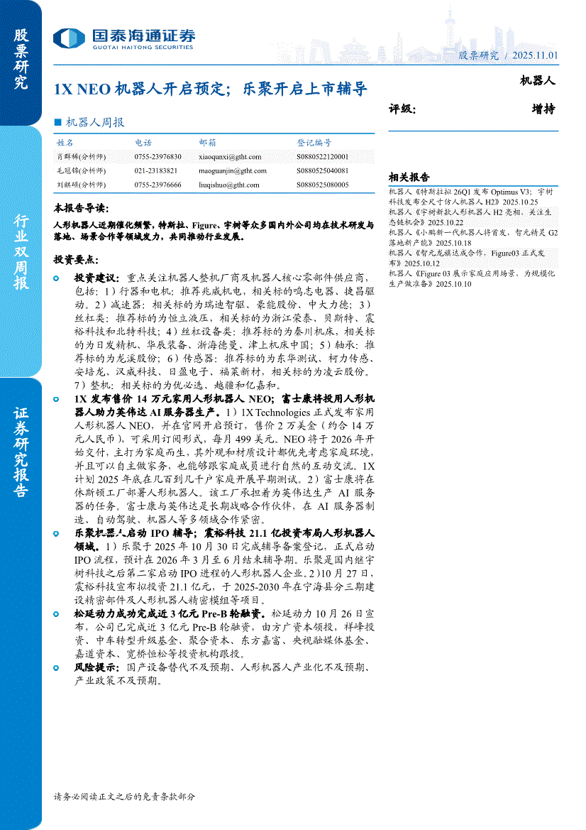 国泰海通证券-机器人行业周报:1X NEO机器人开启预定;乐聚开启上市辅导-251101