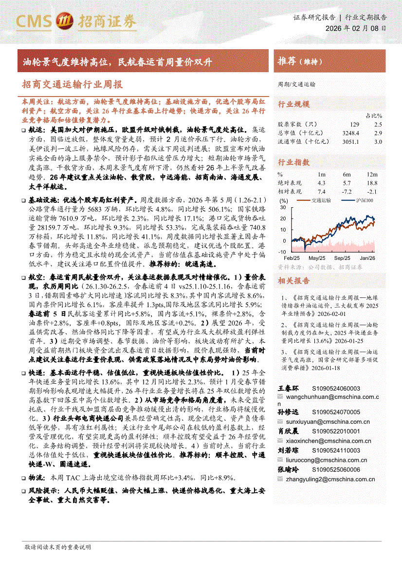 交通运输行业:招商证券-交通运输行业周报:油轮景气度维持高位,民航春运首周量价双升-260208