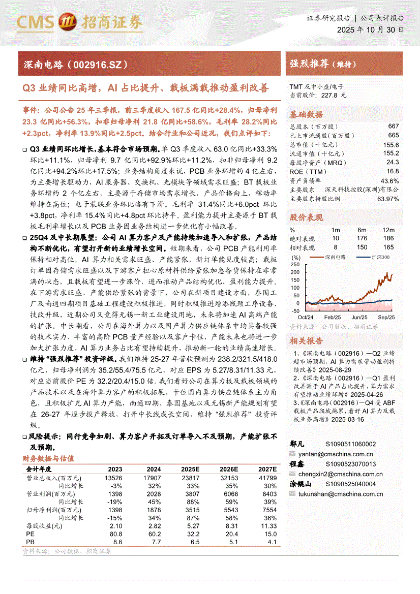 深南电路:招商证券-深南电路-002916-Q3业绩同比高增,AI占比提升、载板满载推动盈利改善-251030