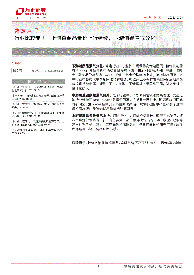 方正证券-行业比较专刊:上游资源品量价上行延续,下游消费景气分化-251006