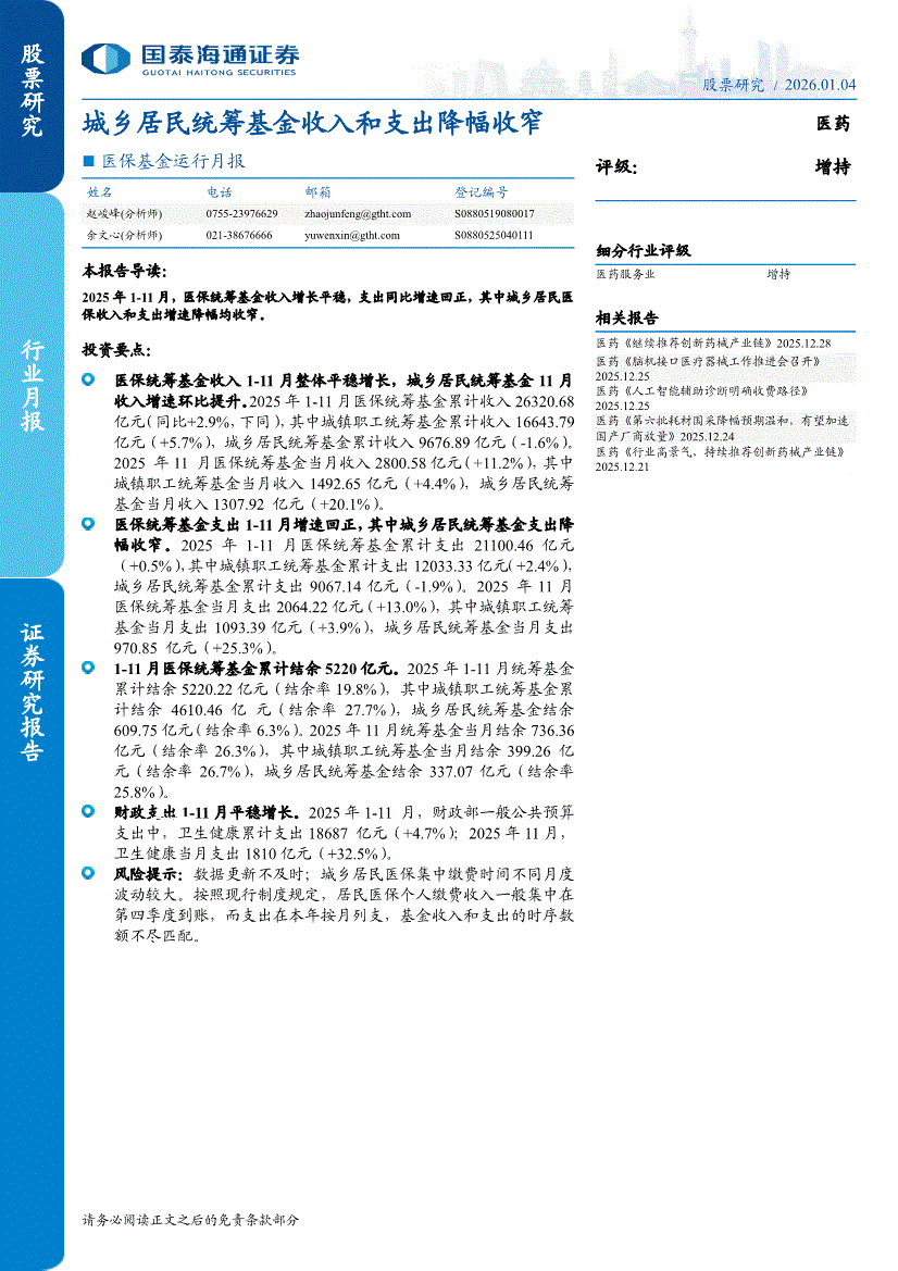医药行业:国泰海通证券-医药行业医保基金运行月报:城乡居民统筹基金收入和支出降幅收窄-260104