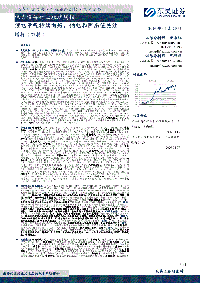 电力设备行业:东吴证券-电力设备行业跟踪周报:锂电景气持续向好,钠电和固态值关注-260420