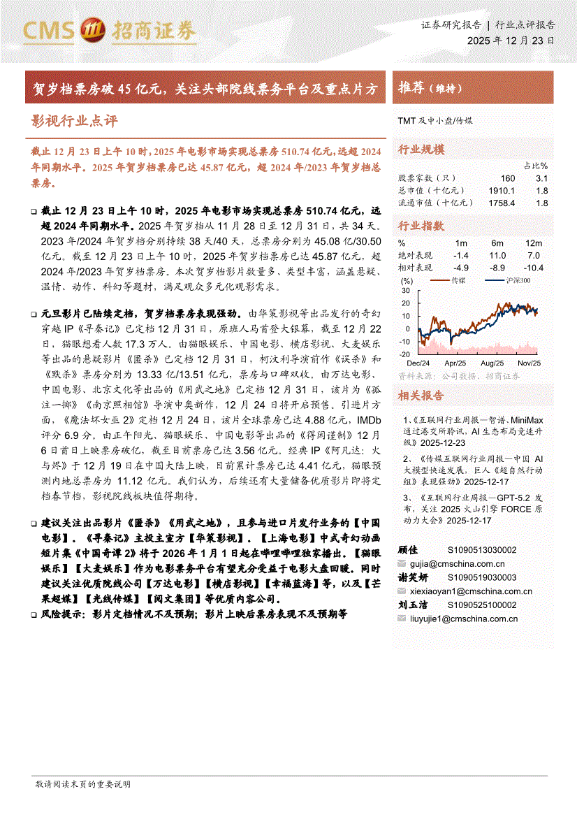 影视行业:招商证券-影视行业点评:贺岁档票房破45亿元,关注头部院线票务平台及重点片方-251223