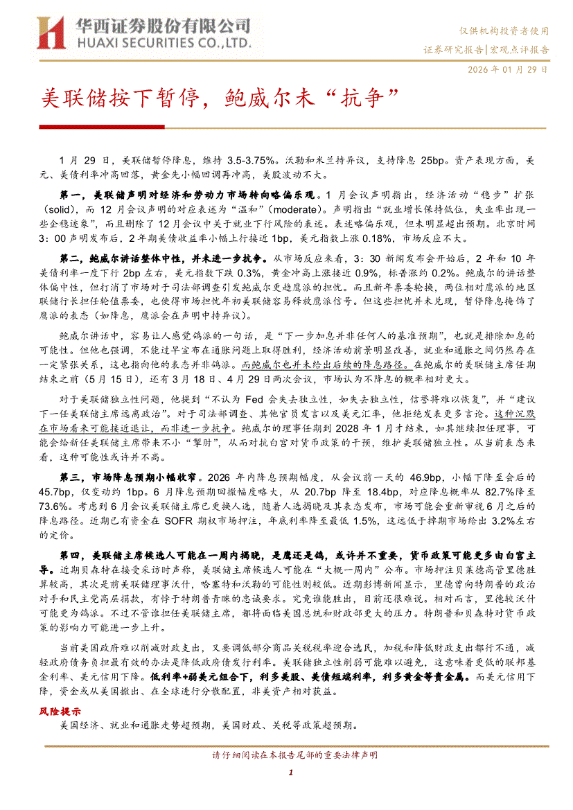 华西证券-美联储按下暂停,鲍威尔未“抗争”-260129